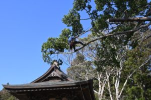 高所作業車や重機が入れない場所でも、ツリークライミングの技術を用いたり、